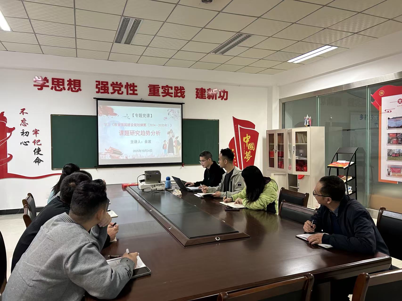 在党课中,以课题研究趋势分析为题,余波带领全体党员系统回顾了《教育强国建设规划纲要(2024-2035年)》的主要内容及重大意义,并提出未来课题研究需要紧密围绕《纲要》提出的目标和任务,聚焦教育领域的重点、难点和热点问题,从教育领域五大关键课题进行了简要分析。并结合当前教育厅、学校课程思政项目及教学改革项目申报工作实际,提出了具体可行的申报方向建议和实践路径。