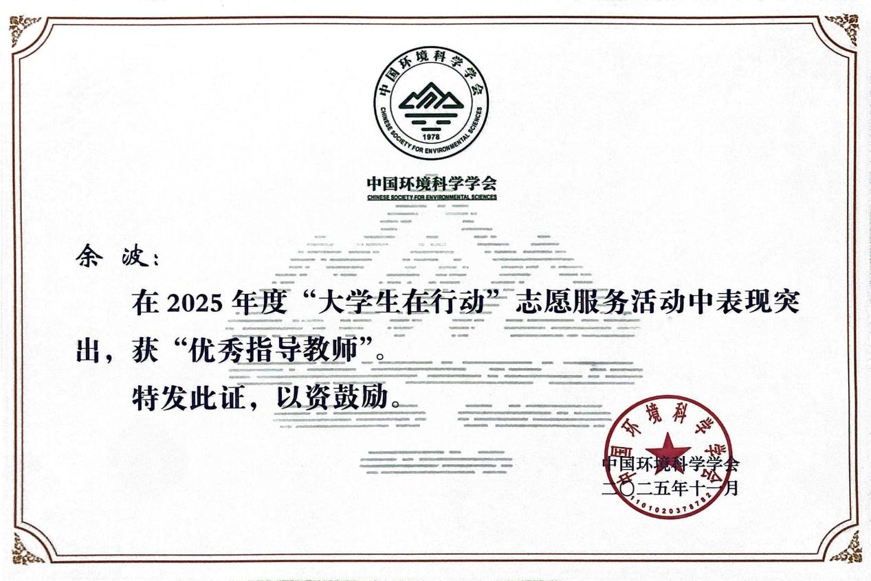 近日,中国环境科学学会下发了《关于表扬2025年“大学生在行动”优秀组织单位和个人的通知》(中环学函字〔2025〕630号),我校“科普苔”生态环境科普志愿服务先锋队因在2025年“大学生在行动”科普志愿活动中表现优异,被中国环境科学学会授予了“优秀小分队”,支部书记、“科普苔”团队骨干成员余波教授被授予“优秀指导老师”的荣誉称号。