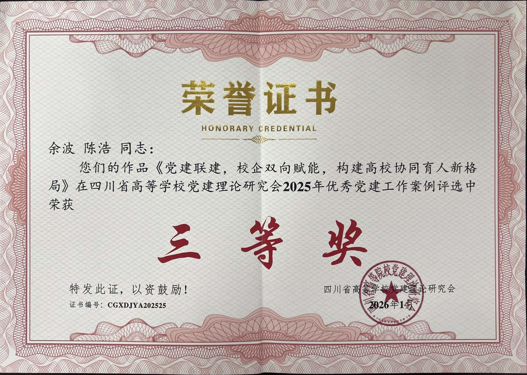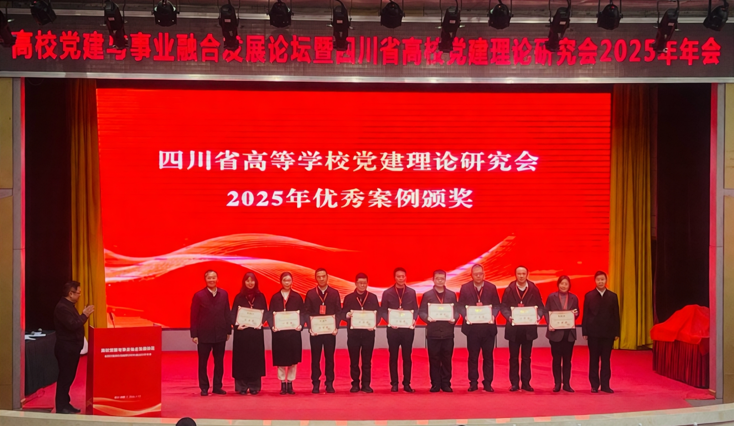 2026年1月15日,高校党建与事业融合发展论坛暨四川省高校党建理论研究会2025年年会在四川师范大学举行。教工二支部书记余波、陈浩提交的党建工作案例《党建联建,校企双向赋能,构建高校协同育人新格局》,从全省高校众多案例中脱颖而出,成功入选2025年度优秀案例并在党建论坛专题展示。