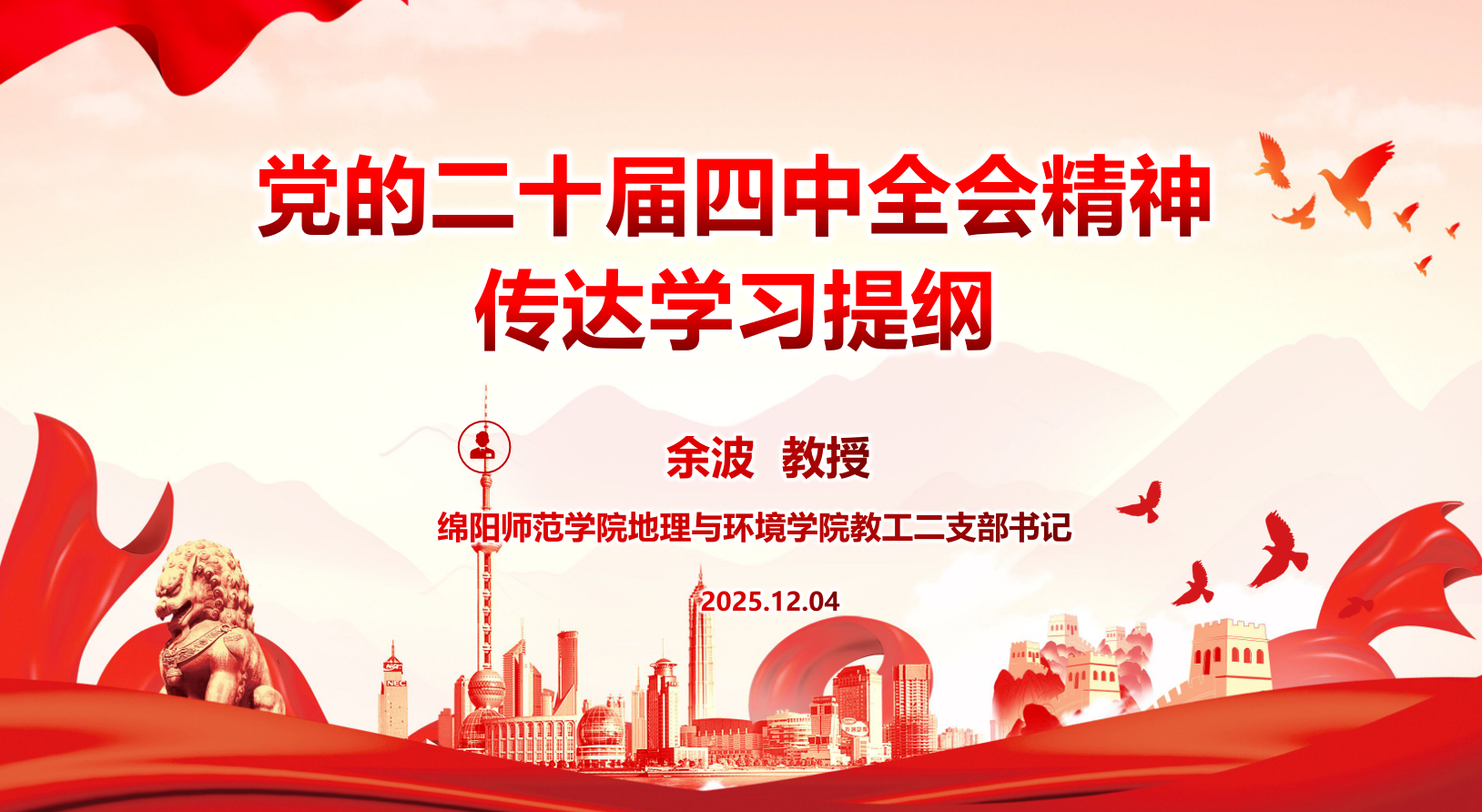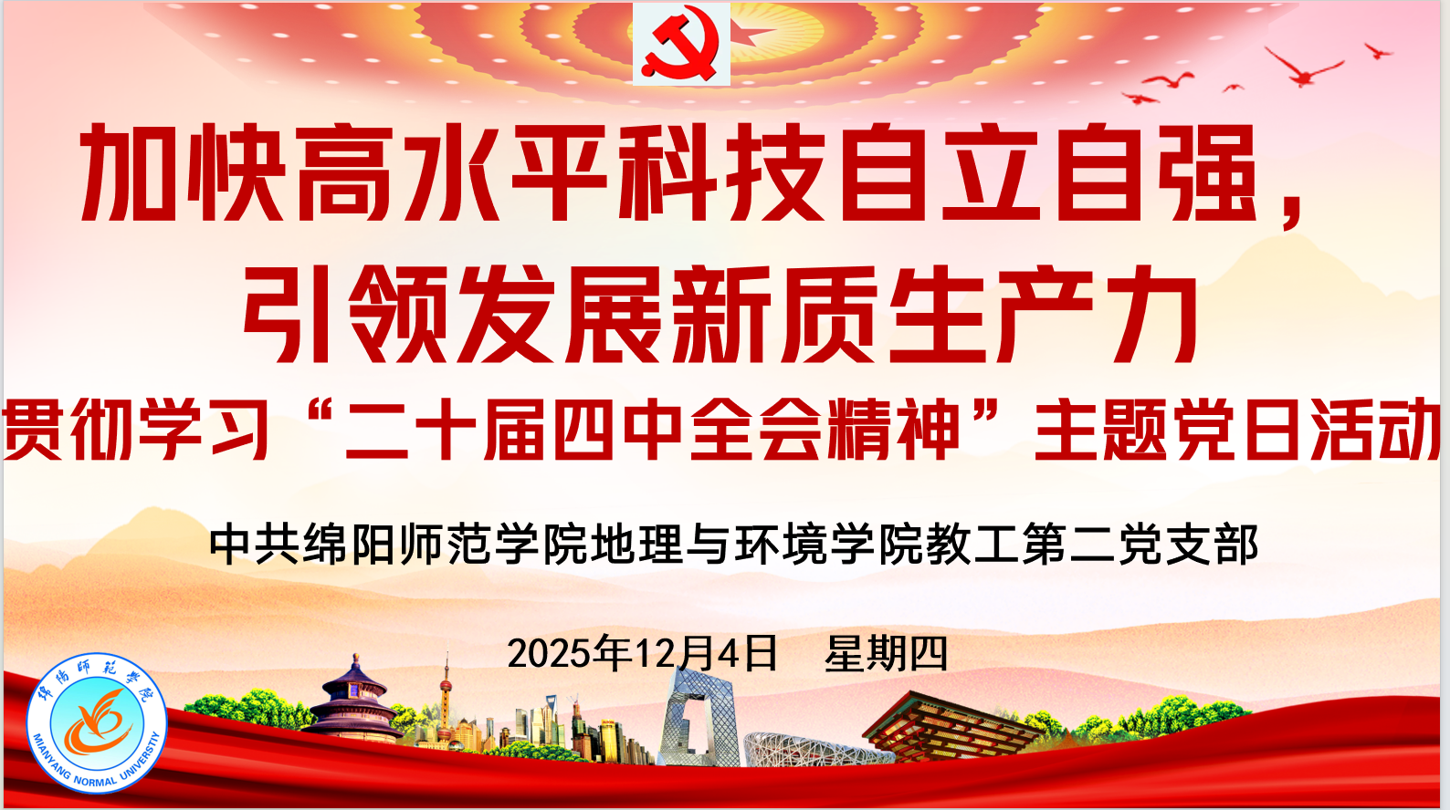 2025年12月4日,绵阳师范学院地理与环境学院教工二支部举行了“加快高水平科技自立自强,引领发展新质生产力”的主题党日活动,深入学习贯彻党的二十届四中全会精神。活动将理论学习和专题党课有机结合,确保全会精神学深悟透、落到实处。
